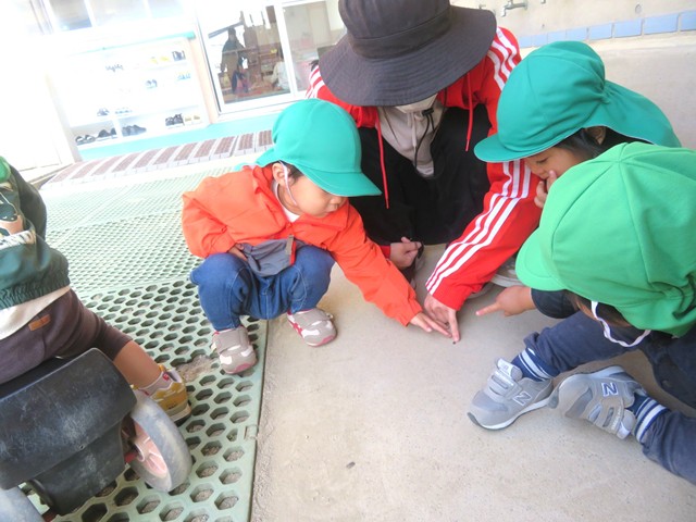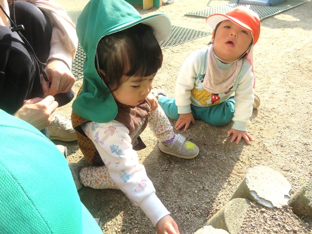 園庭遊びでは 保育士が園庭のあちこちを探し回り 子どもにダンゴムシを みせてくれました