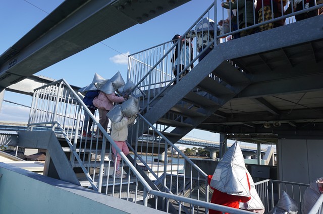 津波が 予想される 想定で 屋上の避難タワーに 向かいます