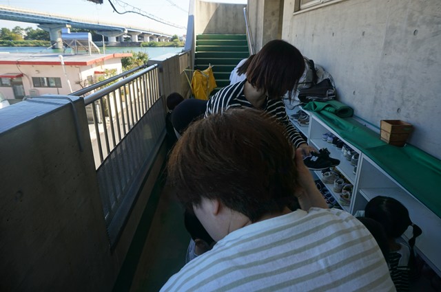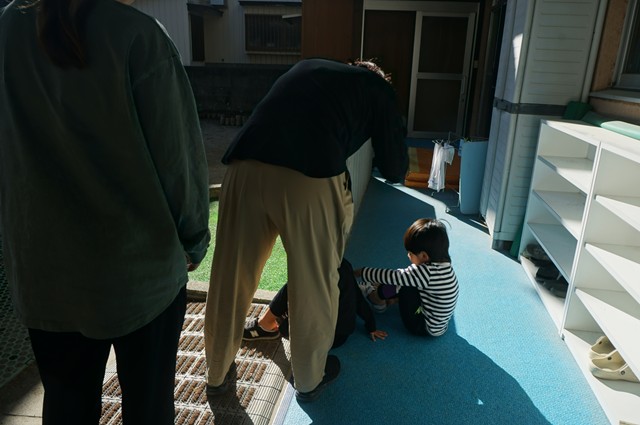 慌てずに靴を履きます