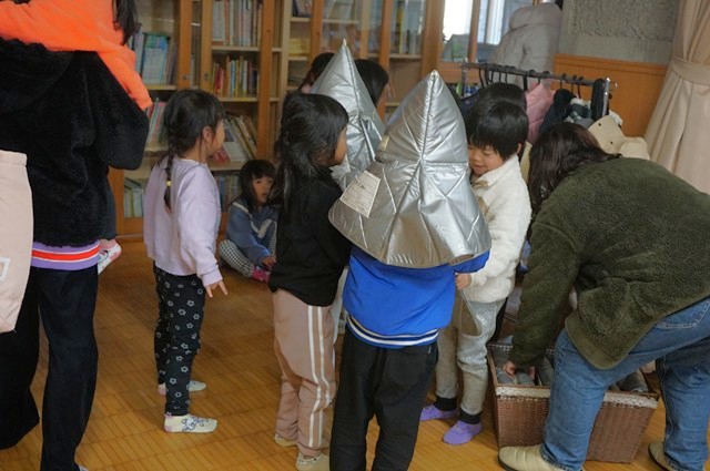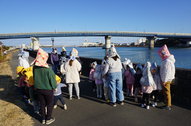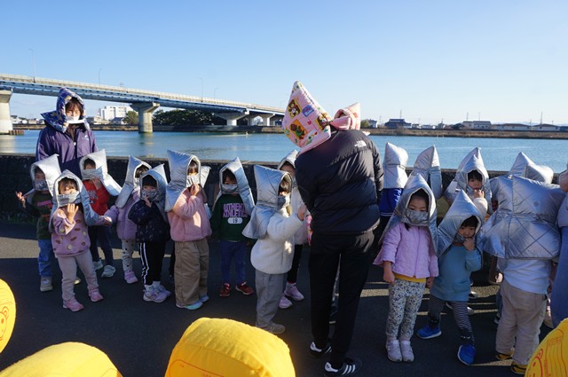 夕方、ベル🔔を合図に、地震訓練を開始。